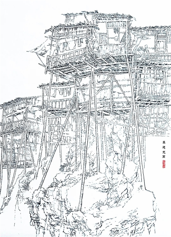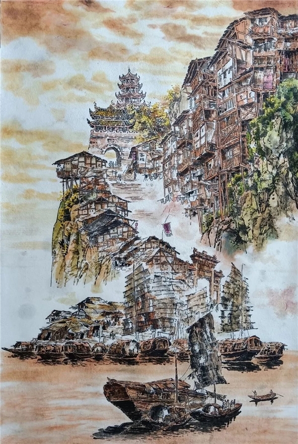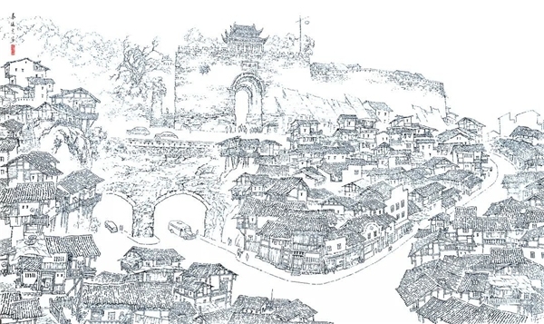 秦廷光:近期,应邀为重庆首部动画电影《火凤重天》场景美术线条设计。其中有渝中半岛、朝天门、洪崖洞、十八梯、若瑟堂、通远门、凯旋路等八十余幅。将在2023年12月1日全国院线上映。现在正准备稿件,准备明年出一本《重庆母城古韵》的画册,内容多为百年前老重庆的风貌,重庆十七座古城门,人们的市井生活等百多幅白描作品。
