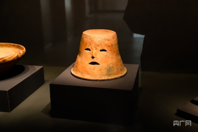 杨官寨遗址出土的镂空人面覆盆型器(央广网记者侯凯奇摄)