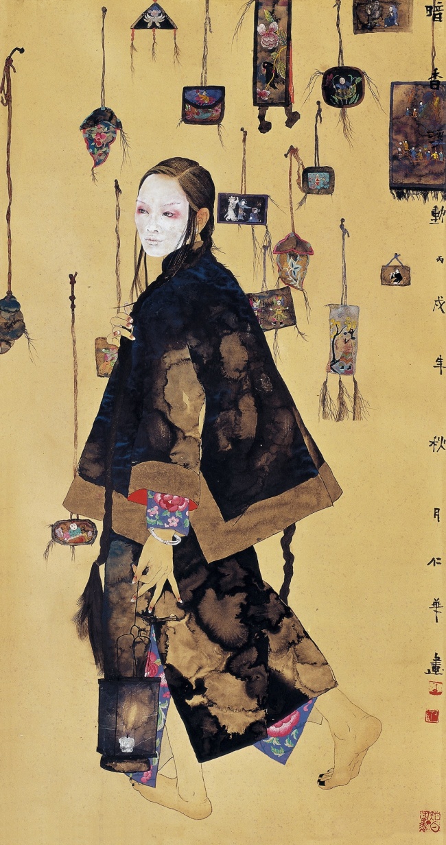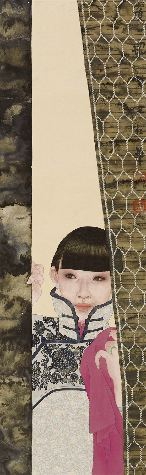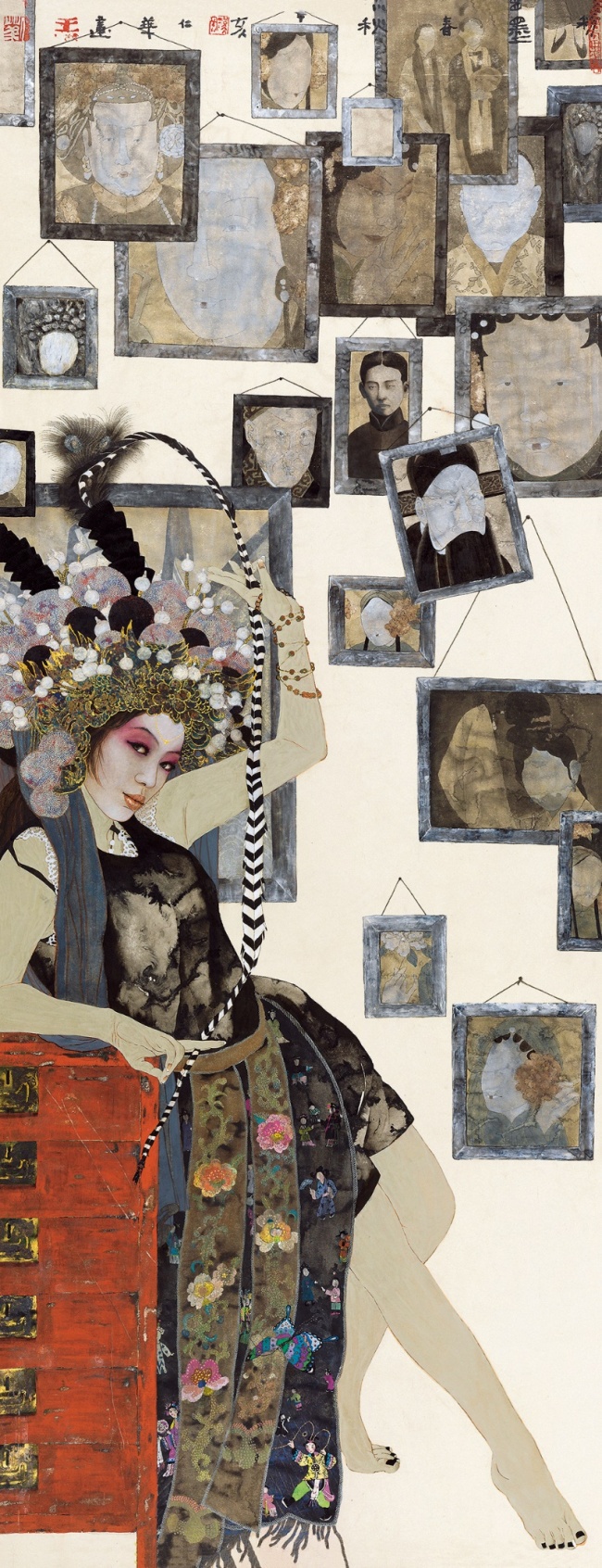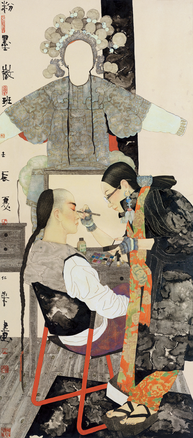 而在主题上,她巧妙地把时尚女性与中国传统戏剧的符号相连接,优雅地揭示着戏台上一位位主人公的“命运”。“戏妆人生”同样也是“亦真亦幻”的一种显现。王仁华非常喜欢戏曲。在中央美术学院求学期间,王仁华不仅得到了系统的指导,还开阔了眼界。她时常主动到戏曲舞台的幕后收集创作素材,与戏曲有关的一切事物都成为了她创作灵感的来源。比如《刀马旦》《花旦》《粉墨登场》等一系列作品,都体现了王仁华对戏曲与美术相结合的思考。在这些画作中,画中人物既沉湎于戏曲故事的角色,也用戏曲的装扮塑造着自我。尚辉认为,王仁华戏曲工笔人物画的魅力正是通过女性时尚元素的渲染与戏曲旦角身份形成的比对,产生了身在舞台、心在现实,或人在现实、心在舞台的某种时空交错感。