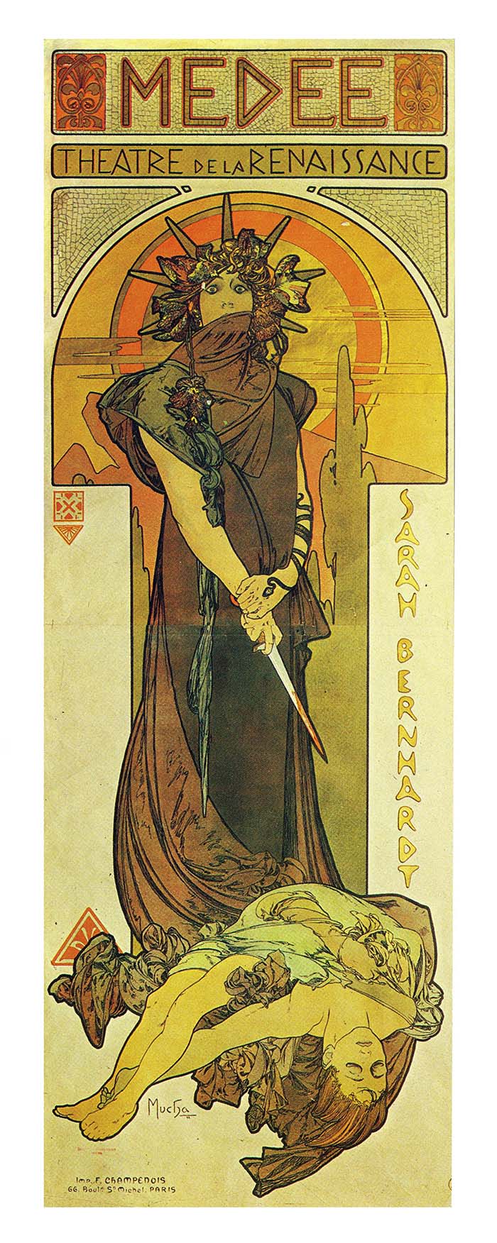 另一幅《美狄亚》则更为精彩。美狄亚是古希腊神话中的悲剧女性,为报复爱人的背叛,亲手杀死了自己的儿女。海报描绘得正是美狄亚手刃骨肉后惊恐的一幕。画面中人物双目圆睁,大惊失色。倒在脚下的孩子身上不见伤口,却由美狄亚手中血迹斑斑的匕首暗示了其死亡的事实。背景中一轮血色残阳缓缓落下,预示着悲剧的发生与落幕。在表现较为阴暗的题材是,慕夏经常将人物的皮肤绘制成酱紫色或浅咖色。较之其他海报,《美狄亚》的整体色彩也更为沉着,海报整体画面充满了戏剧性表现张力,展现了慕夏杰出的绘画才能。