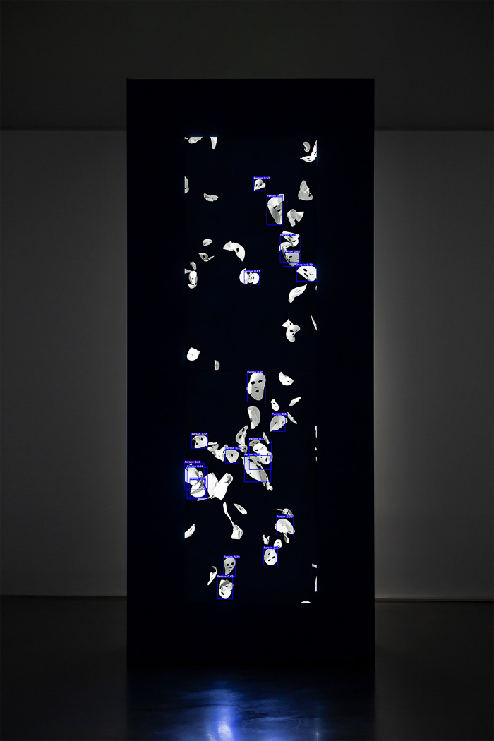 作品《自由落体》中,由计算机模拟出的纯白面膜无限下坠,纵向连接的显示屏幕呈现了自上而下的观看视角。作品的另一层画面是由机器视觉识别系统构成,即对影像内容的监控与识别。系统根据面部识别算法判断画面中坠落的面膜是否与人脸的特征吻合。蓝色显示框内的数值(0或1)代表了被机器辨别出的 “人脸” 与 “真实人类” 的近似值,0代表近似值低,1代表近似值高。