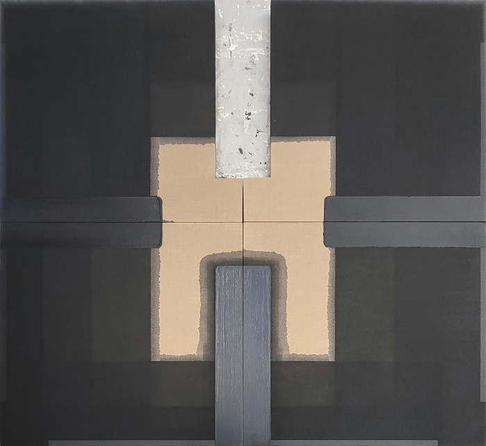 2018年起,金日龙的绘画作品逐渐去掉了华丽色彩,理性因素渐渐成为主导。在作品《外》中我们可以发现,艺术家将不同大小和方向的矩形铺满整个画面,形成了多个色块所共同构成的不规则的范式。这些矩形的组合看似随意,却是金日龙长期积累的艺术经验的自然流露,这种画面风格逐渐被提炼为“T”字形和“十”字形架构。