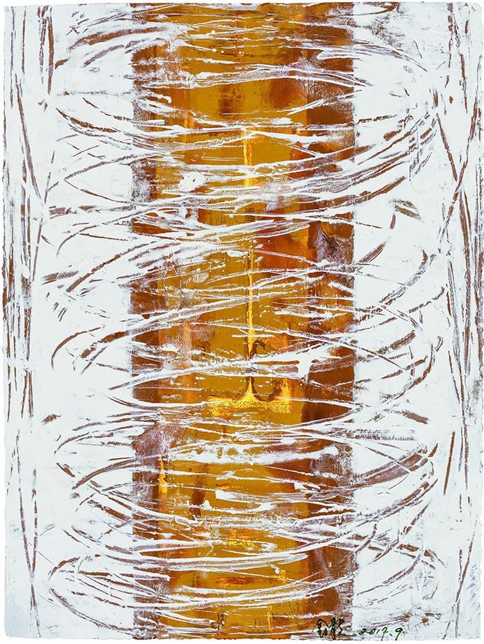 在金日龙2019年至今的绘画作品,如《天地玄黄》系列、《自约》系列、《恒》系列以及《心音》系列中,我们可以见出,艺术家的绘画风格逐渐趋于安静内敛,理性化的特点尤为突出,作品中不再有以往的无序和不稳定感,取而代之的是一种秩序、沉着与平静。金日龙以减法的方式越来越使画面回归单一、简约,极度理性的深处渗透着简练的感性。
